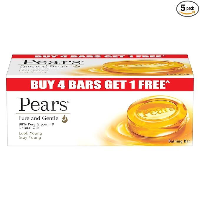 Pears Pure & Gentle Soap Bar (Buy 4 get 1 free) – With Glycerin for Soft, Glowing Skin & Body, Paraben-Free Body Soaps For Bath
